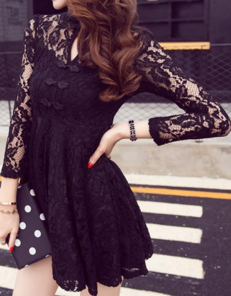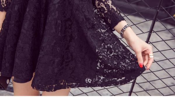 エレガント 胸開きシースルーレース切替 スリムAライン チュニック 黒