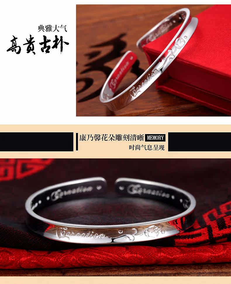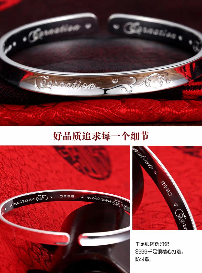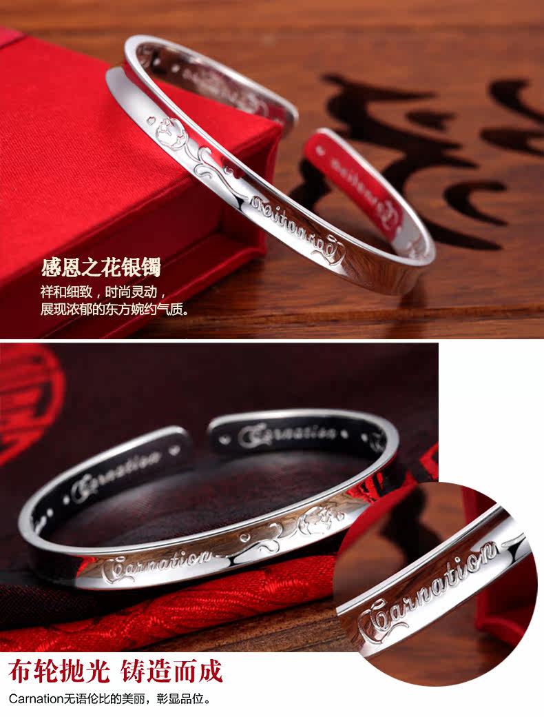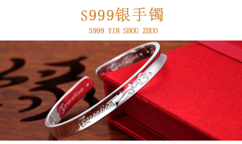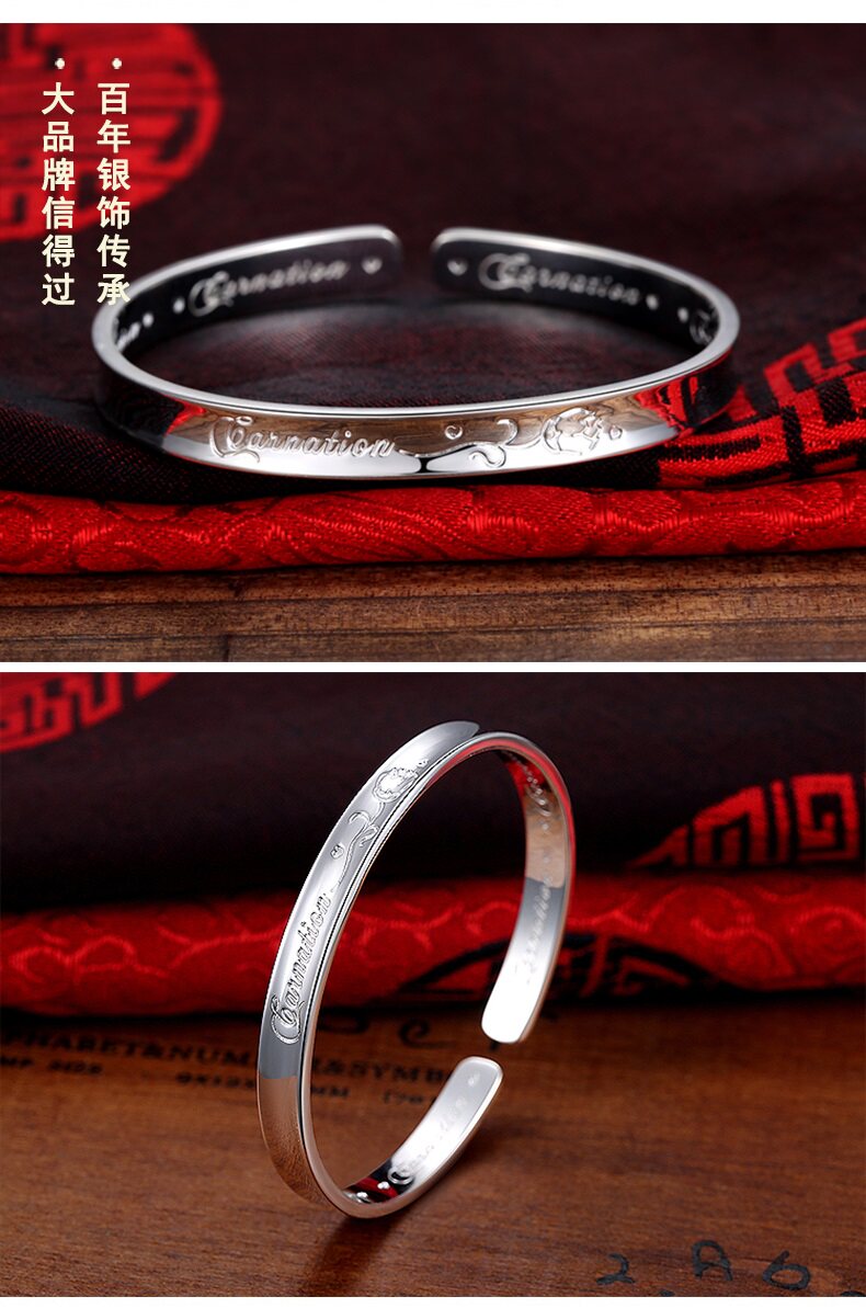 S999足银手镯 康乃馨贵妃镯银手镯开口窄面银镯子