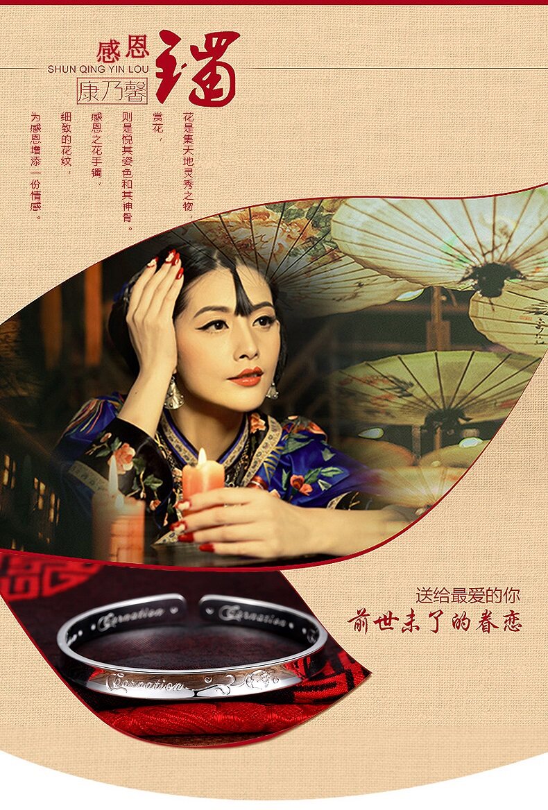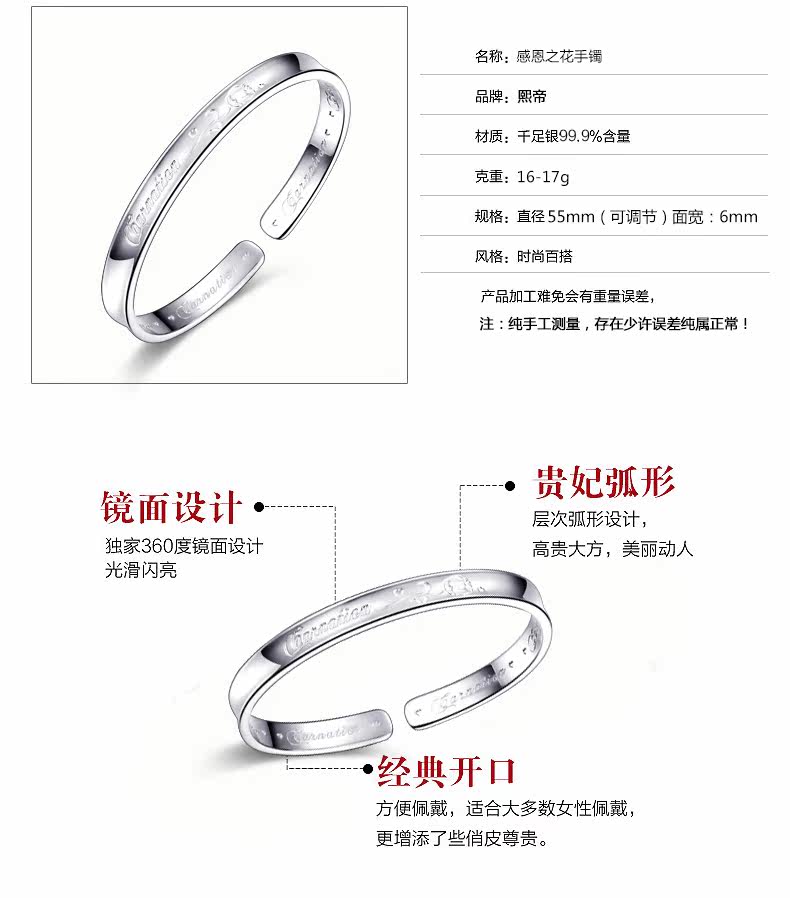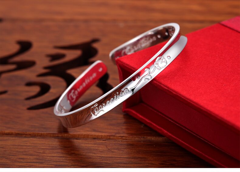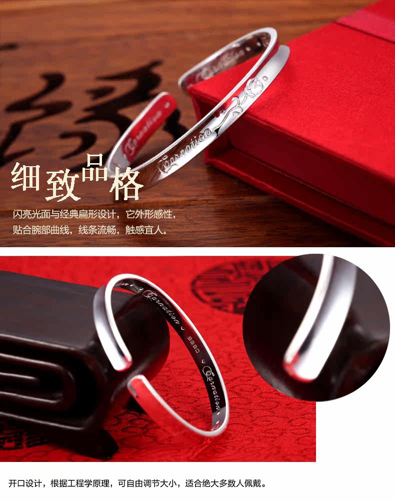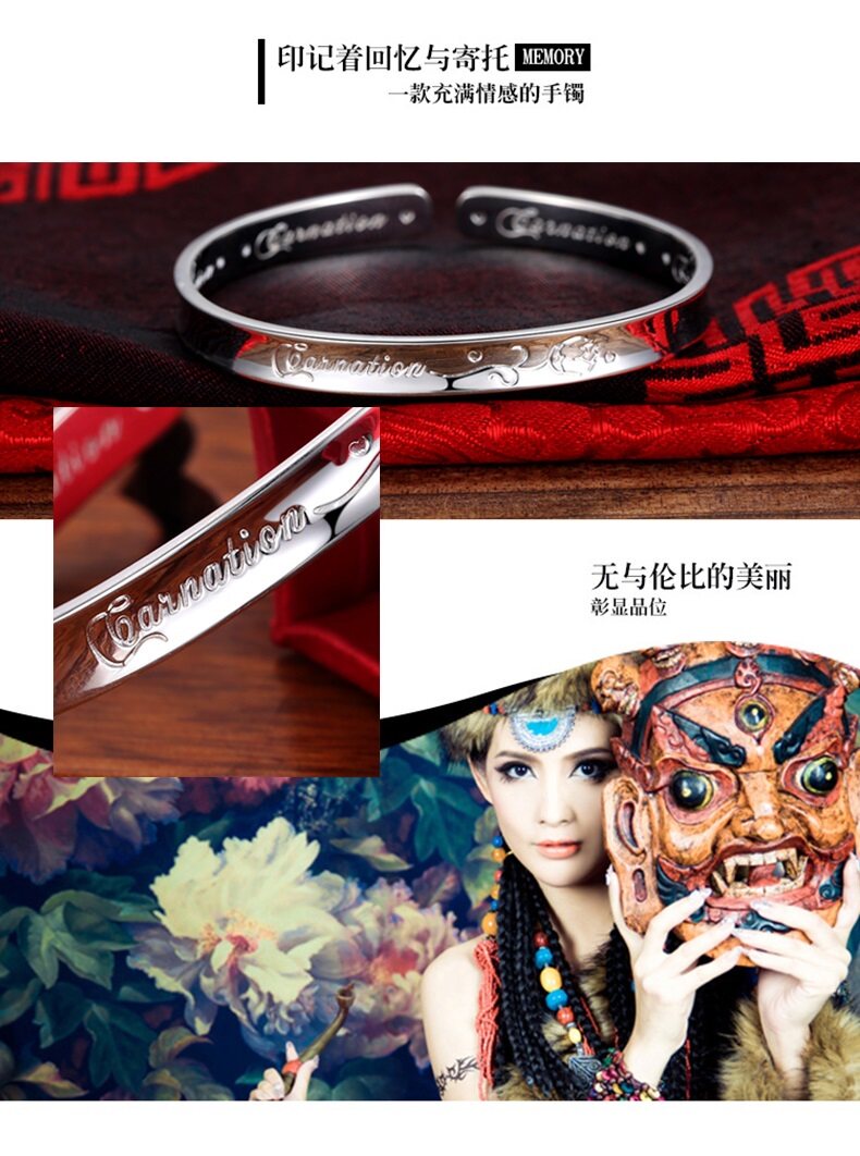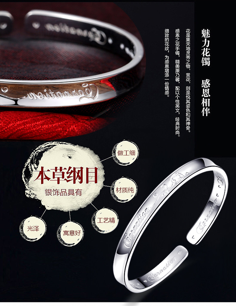 S999足银手镯 康乃馨贵妃镯银手镯开口窄面银镯子