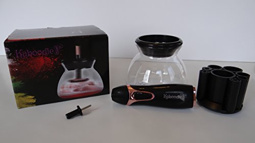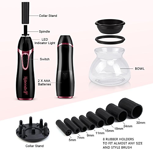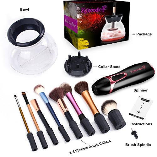 - PACKAGE INCLUDES: 1 x Kaboodle Premium Makeup brush device , 1 x Brush Spinner Bowl, 1 x Attachment Spindle, 1 x Silicone Seal and Splash Guard Ring, 8 x Rubber Collar Holders (different sizes). NOTE: 2 AAA Batteries not included, CAUTION: Please keep the Kaboodle Premium Electric Spinner Makeup Brush Cleaner inside the bowl when powered on. -The liquid in the bowl must be less that 1/3 in the bowl.