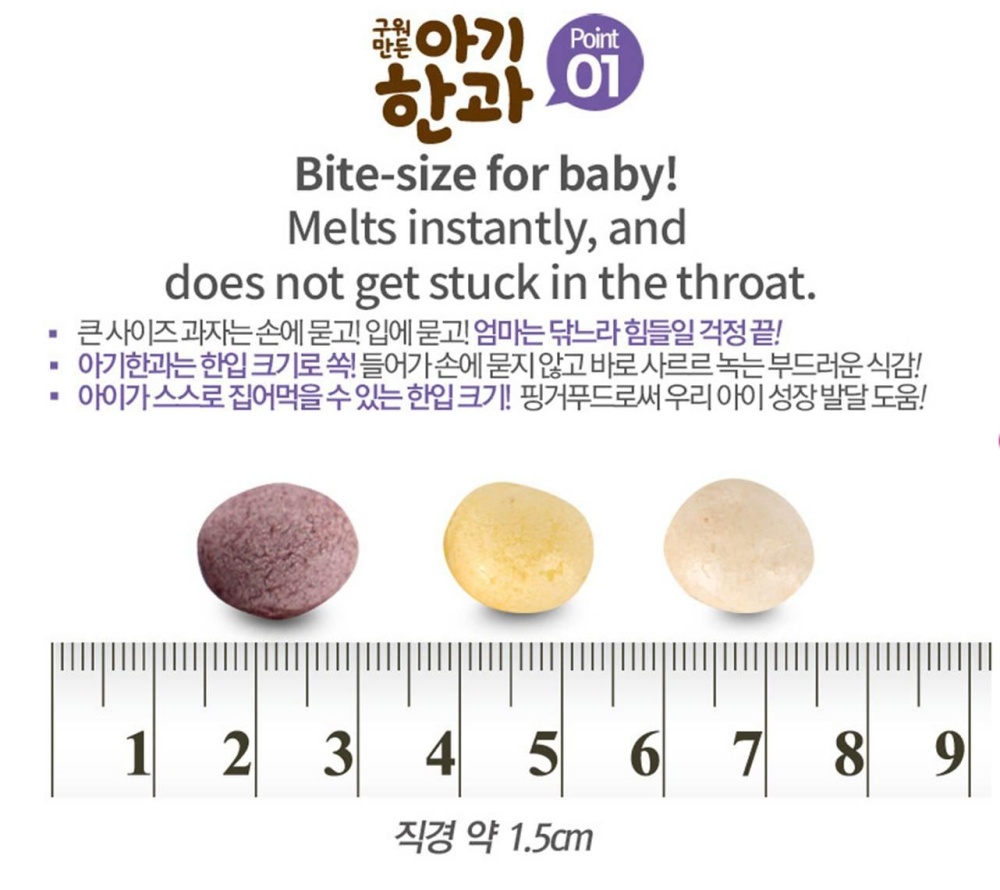 Snack should be given to baby under adult supervision. Ensures snack melts thoroughly in baby’s mouth. Do not feed when your baby is not in upright position. Be sure to check whether your baby has any allergic reactions with this snack.