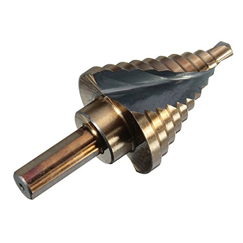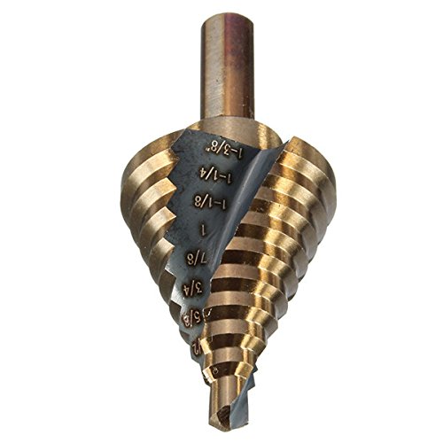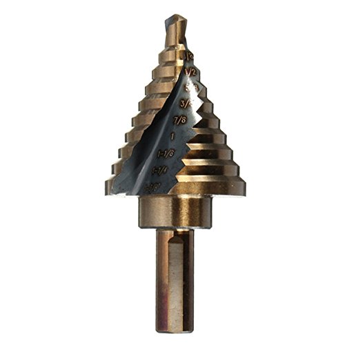 Specification: 1/4" to 1-3/8" Spiral Flute Step Bit (10 Steps) Steps: 1/4", 3/8", 1/2", 5/8", 3/4", 7/8", 1", 1-1/8", 1-1/4", 1-3/8" Solid Cobalt M42 Steel Shank Size: 3/8" Features: New Spiral Flute Design Cuts Faster and Straighter Two Flute Design Automatically Deburrs While you Drill 3 Flat Sides on the Shank so the Bit will Not "Spin" in the Chuck Package Included: 1 x Step Drill