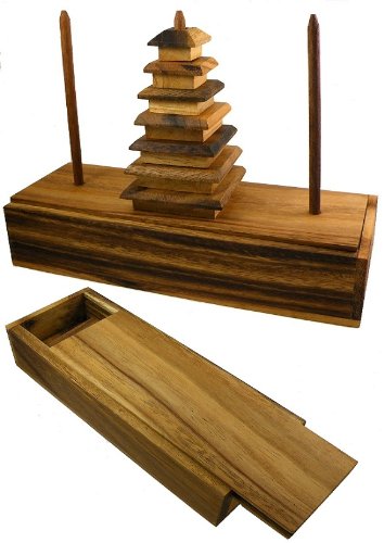 Tower of Hanoi Chedi - Wooden Brain Teaser Puzzle. This famous mathematical Tower of Hanoi Chedi Wooden Brain Teaser puzzle can be used in math lessons at school or for management tests! Features 7 large tower rings in a beautiful chedi style. Starting with all 7 pieces placed on the central stand, the goal is to transfer all the pieces to any of the other stands in their original order! You may move just one piece at a time, and a larger piece cannot be placed over a smaller one. All pieces can be stored inside the box for safe keeping. Materials: Natural Wood. Dimensions: 9.5" L x 3.5" W x 8.33" H Weight: 1.3 lbs