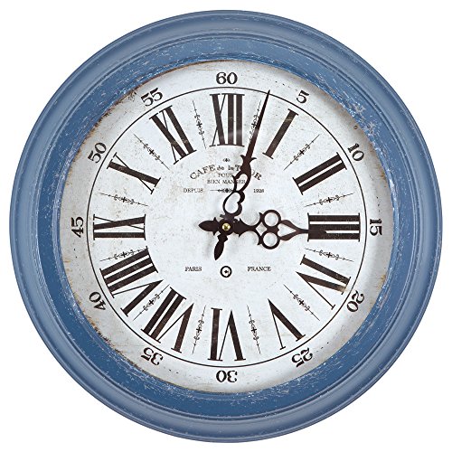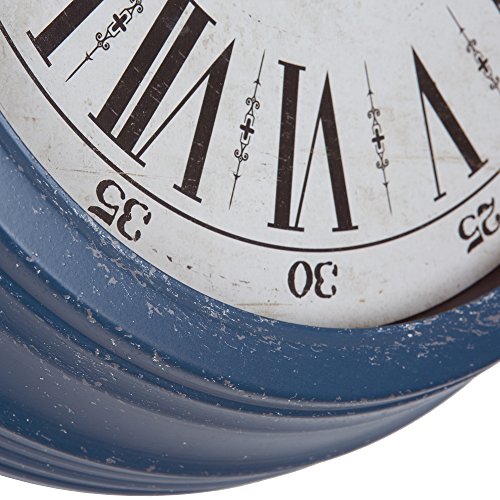Circular wall clock in distressed turquoise paint and roman numerals on dial; Dimensions: (L x W x H) 3.5"x16"x16" Requires one AA battery
