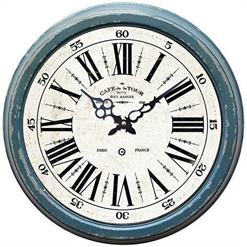 This lively wall clock features an iron frame in a distressed time worn turquoise color. The dial is a bright white with roman numerals and intricate hands. There are spears in between each number adding to the detail of the design. The words CAFE de la TOUR are printed just under the twelve giving it a European cafe touch. This clock would go great in any kitchen or dinning area.Feature