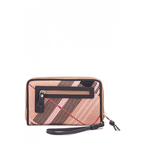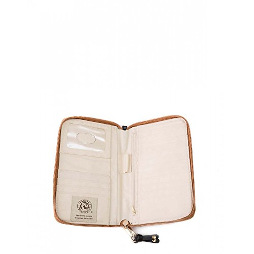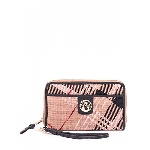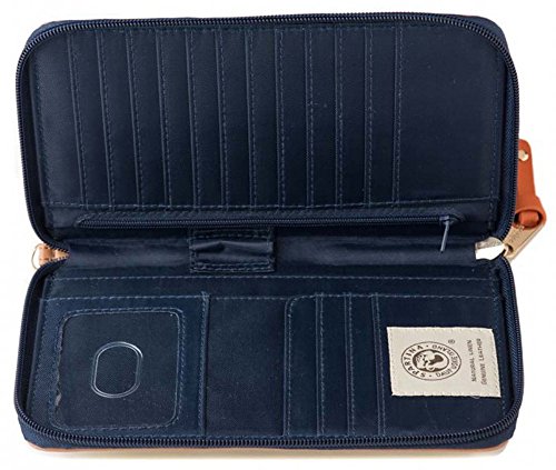 -. Feature : Signature linen with leather accents -Gold tone mermaid logo medallion / Removable wristlet -Exterior zip pocket and exterior snap pocket / Polyester interior lining -16 card slots -2 bill pockets and I.D. window / Interior zip pocket and pen holder / Height: 5" -Depth: 1" -Width: 8"