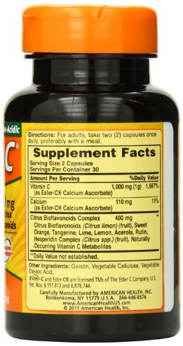 ReleaseDate : 2015-06-22 Studio : American Health Publisher : American Health Binding : Health and Beauty Product Description AH Ester-C 500 mg (60 capsules). Ester-C is a breakthrough patented Vitamin C formula supported with naturally occurring metabolites. Metabolites help enhance the absorption of Vitamin C by your white blood cells, an important part of your immune system. Ester-C's unique, chemical-free manufacturing process neutralizes pH, making it non-acidic and gentle on the stomach. In a daily 1,000 mg dose, Ester-C delivers 24-hour immune support...so once a day is all you need. 0