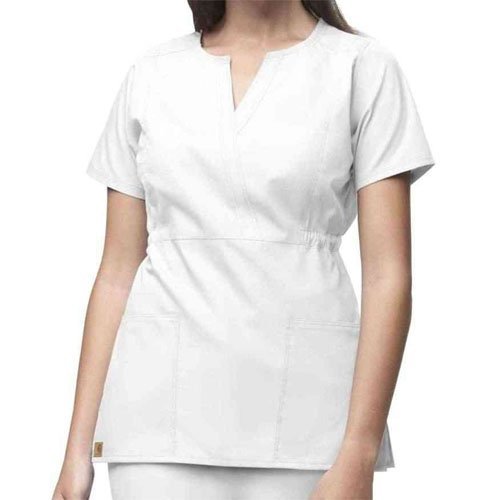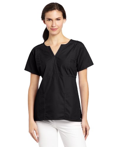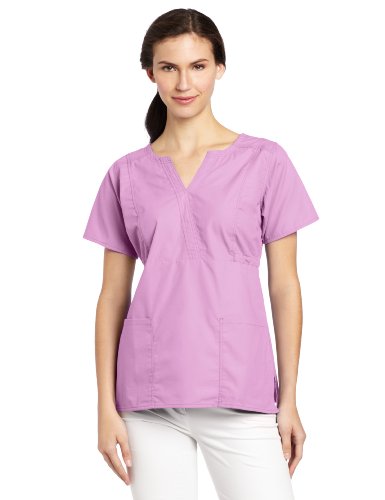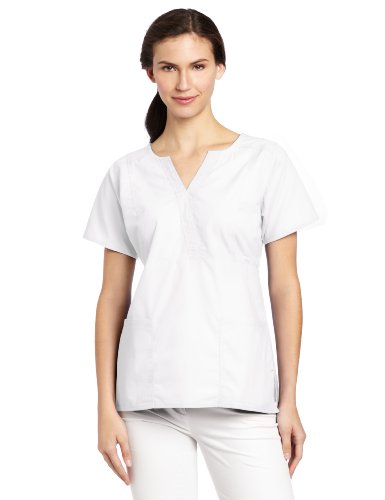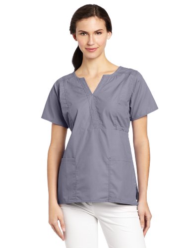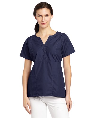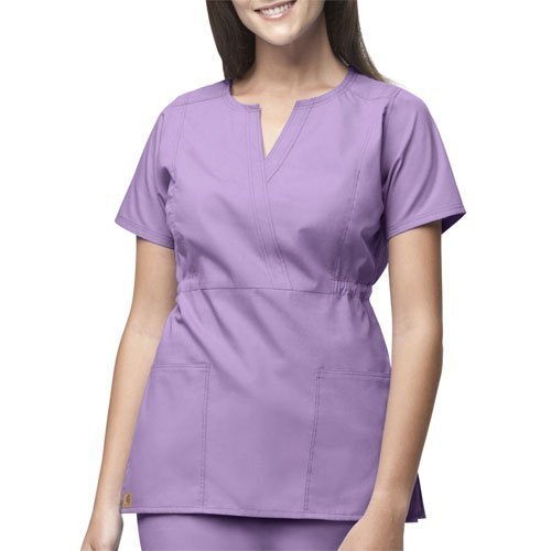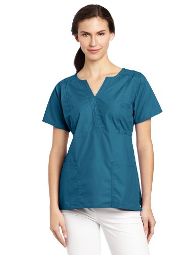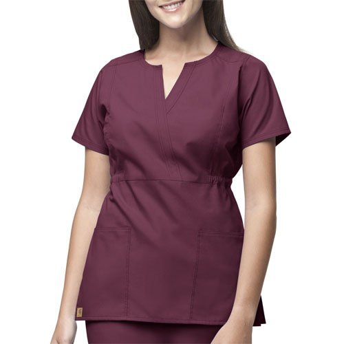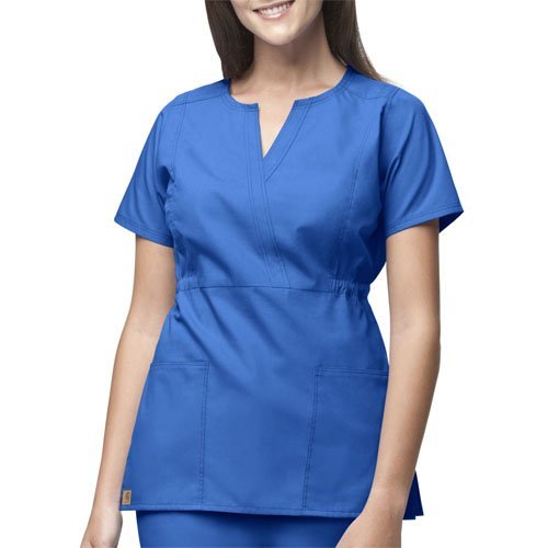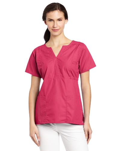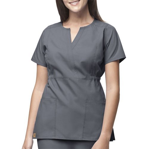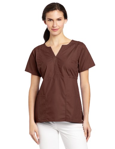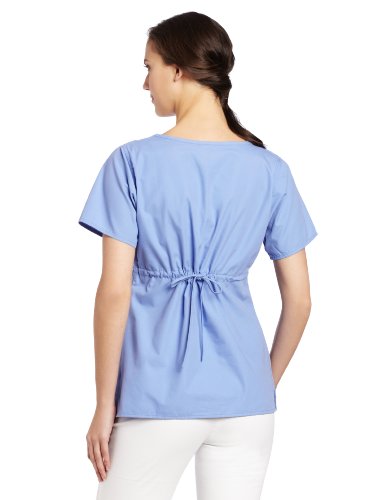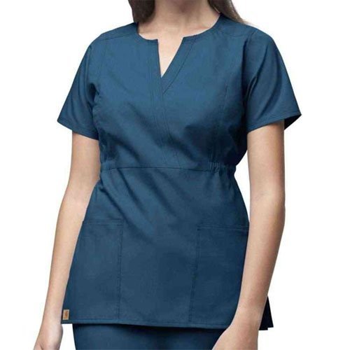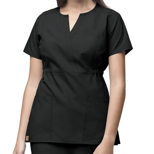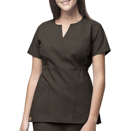 Women's fashion waist top, two front pockets, fashion neckline, front princess seams, shaping bust darts, back waist tie, brushed micro canvas, 55 percent cotton/45 percent polyester