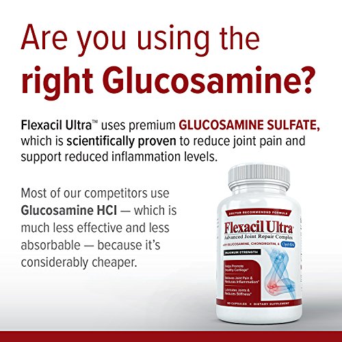 TOP QUALITY INGREDIENTS WITH PROVEN RESULTS: Our trusted, all-natural formula uses the highest grade Glucosamine and Chondroitin available. While the majority of joint supplements on the market use Glucosamine HCI, which is a cheaper, less effective, less absorbable form of Glucosamine, Flexacil Ultra contains Glucosamine Sulfate, which has been shown to reduce joint pain, maintain healthy cartilage and tissue, and support reduced inflammation levels BETTER than Glucosamine HCl.