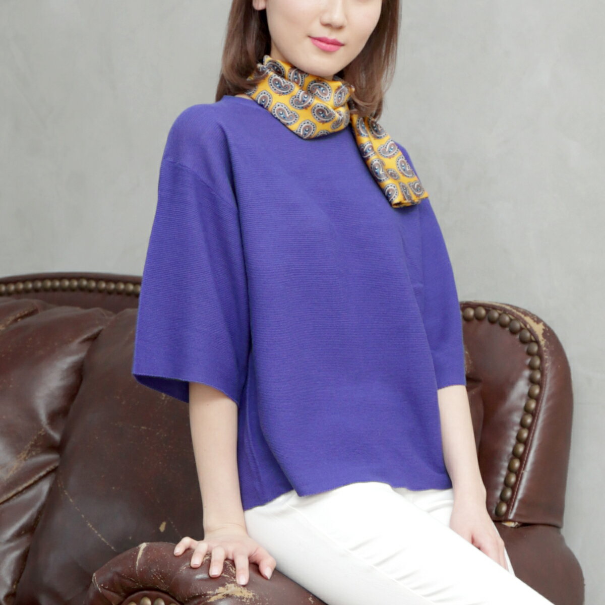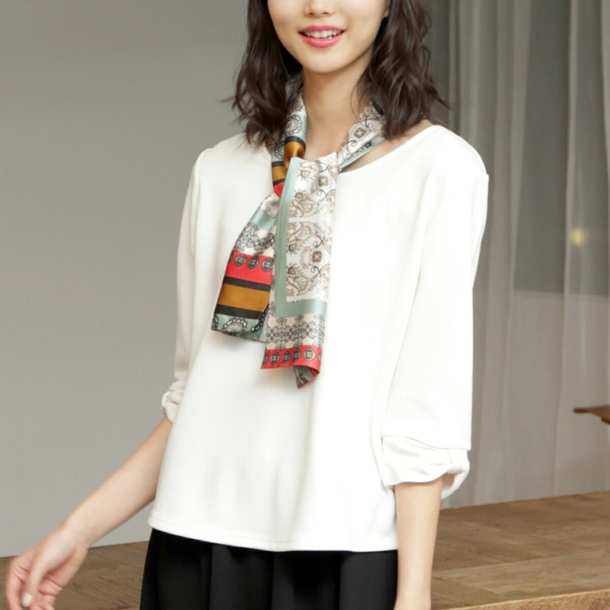 スカーフ柄モチーフのマルチストールは、アレンジしやすい縦145c×横15cのサイズ感です。