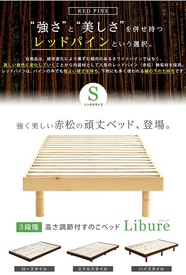 【商品について】3段階高さ調整付きすのこベッド(シングル) レッドパイン無垢材 ベッドフレーム 簡単組み立て|Libure-リビュア-■サイズ:外寸:幅98cm×奥行200cm×高さ33cm※商品重量:(約)21kg■カラー:ナチュラル ブラウン ホワイトウォッシュ■素材:本体:天然木(パイン材)すのこ:合板(LVL)表面材:ラッカー塗装■その他:・お客様組立商品です・梱包サイズ:(約)103x43x17.5cm・梱包重量:(約)23kg