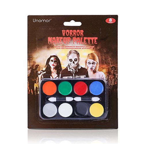 UNOMOR Face Paint to surprise your friends at Halloween or costume party. With this 8 colors palette, makeup pro can create your own thing with this paint easily. For makeup starters, you can get many creative ideas from Youtube or Pinterest, filling your house with laughter and creativity! No matter you wanna be a vampire, the Walking Dead, Frankenstein's monster, a skull, an alien, or anything else, this is for you!