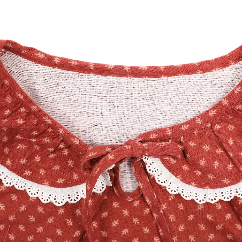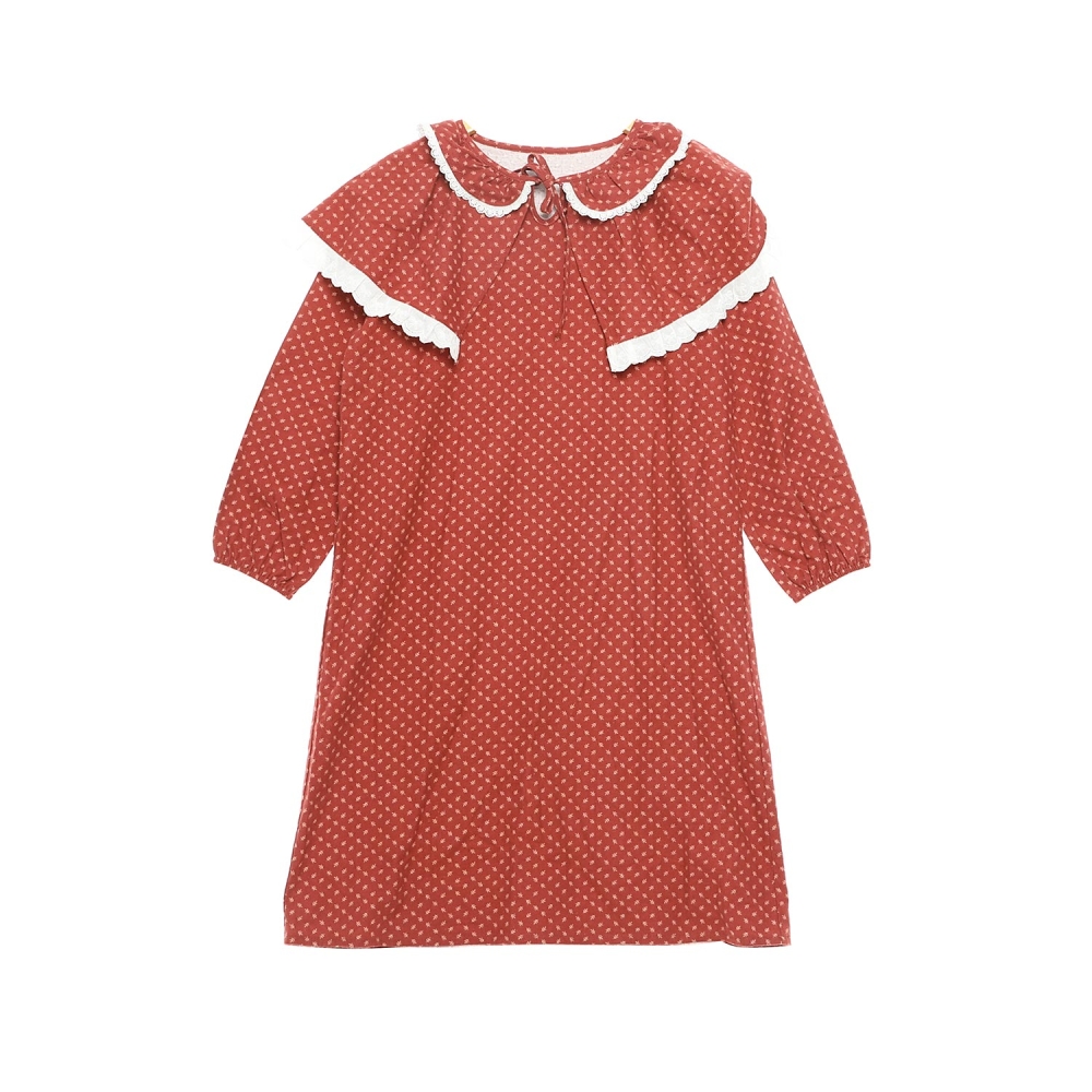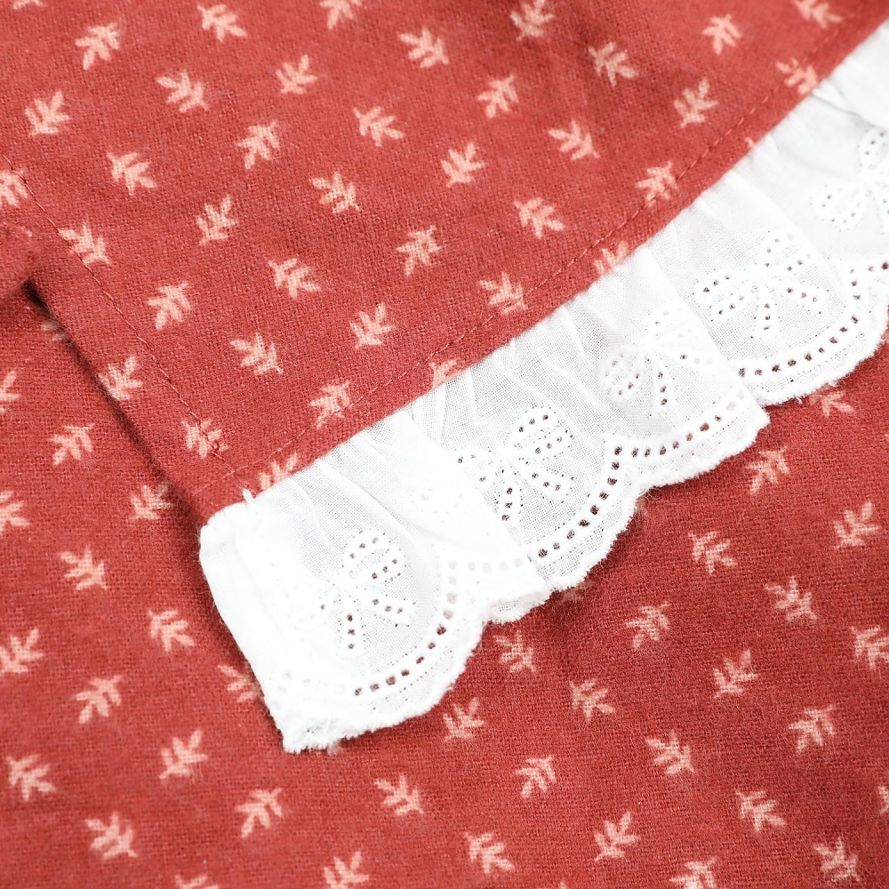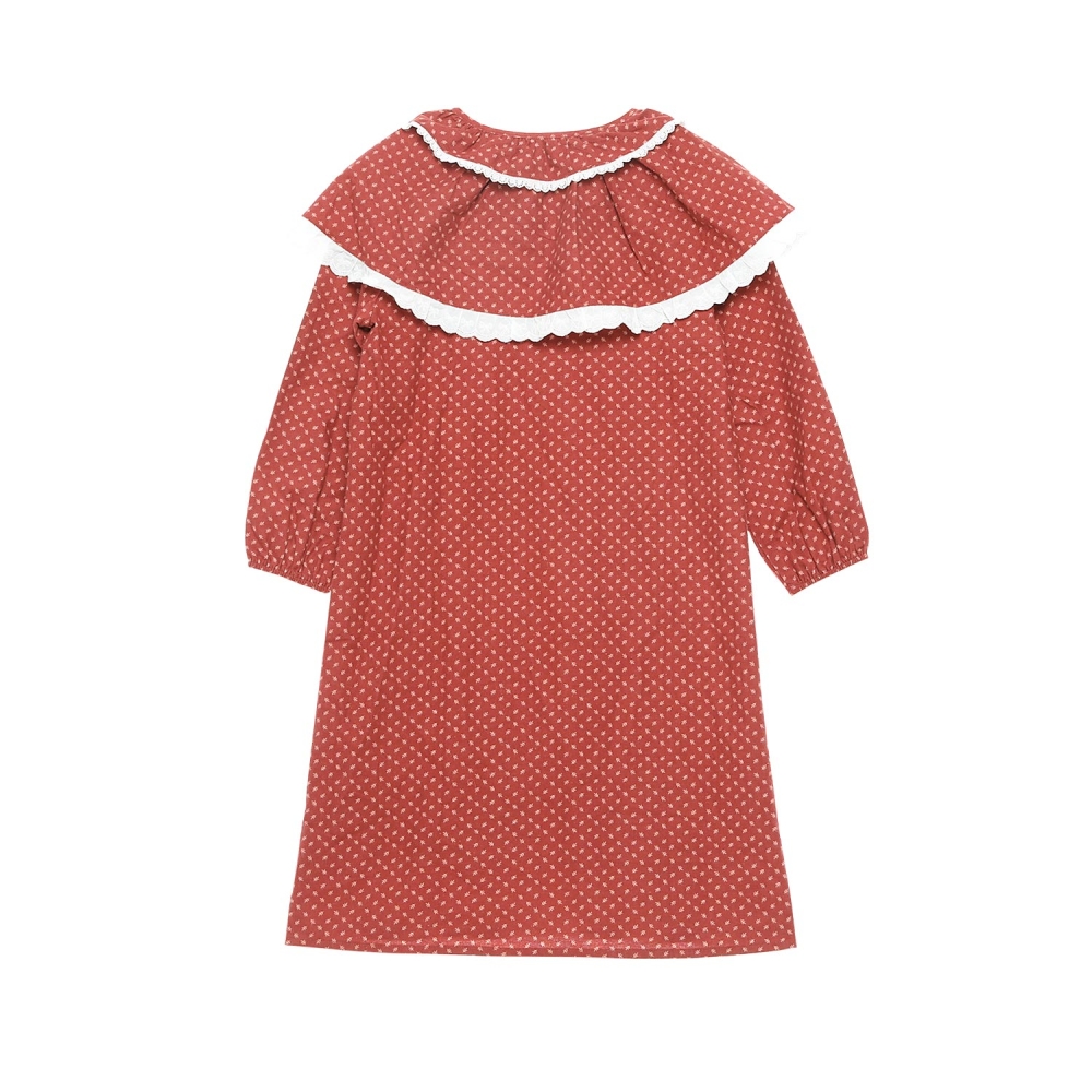 40's 평직 기모가공 나염의 여성용 원피스 파자마. 잔잔한 패턴 문양과 이중 프릴 칼라로 더욱 더 포근하면서도 편안한 감성을 자극. SCMNU961 상품과 커플 상품. SCWNU961 상품과 연동 상품.