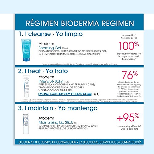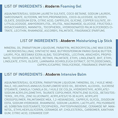 Atoderm Shower Gel : A daily gentle soap-free cleansing shower gel that respects the fragility of the skin. Atoderm Stick Lèvres : A daily moisturizing and soothing stick for damaged lips. Atoderm Intensive Baume : A 2-in-1 soothing and dermo-strengthening treatment to restore healthy, comfortable skin.Feature