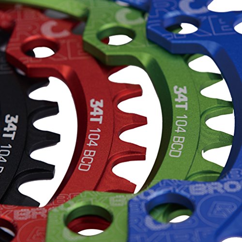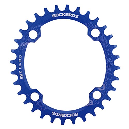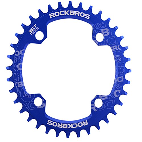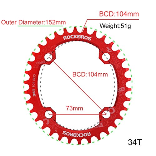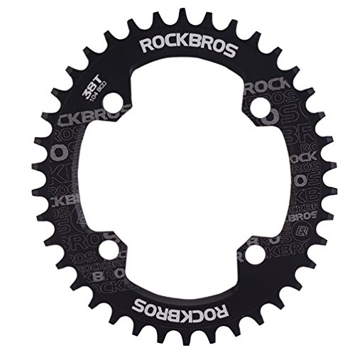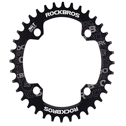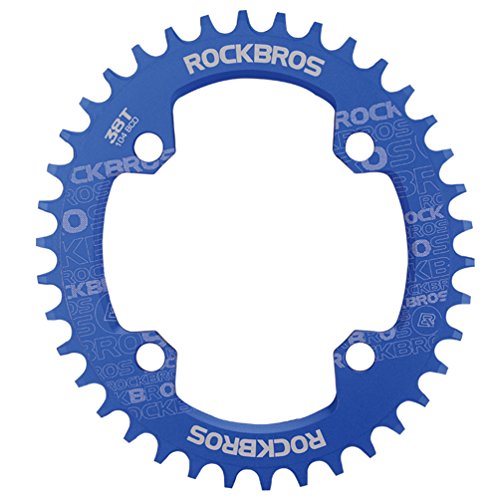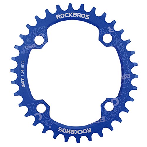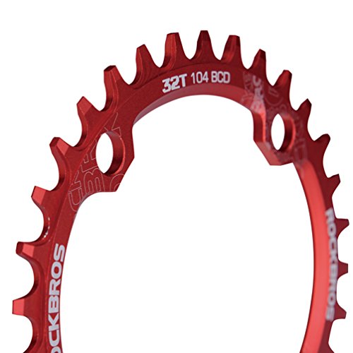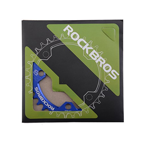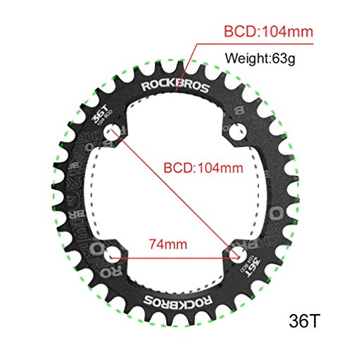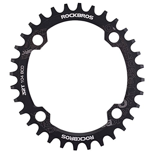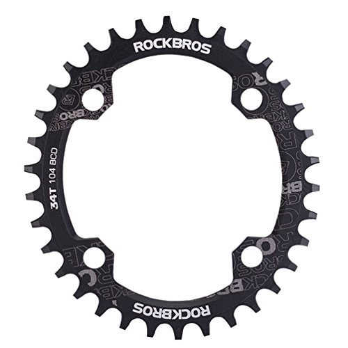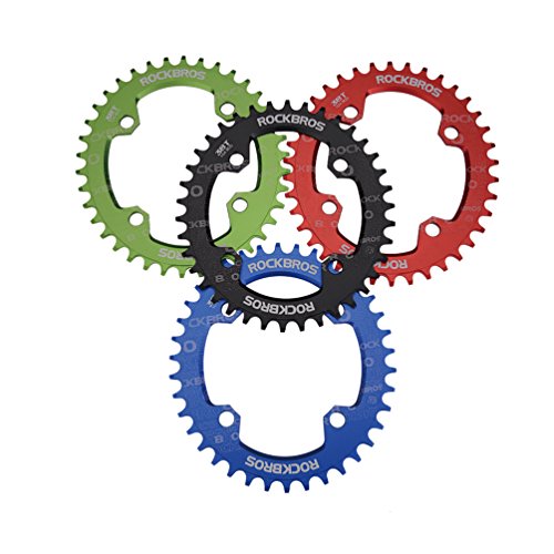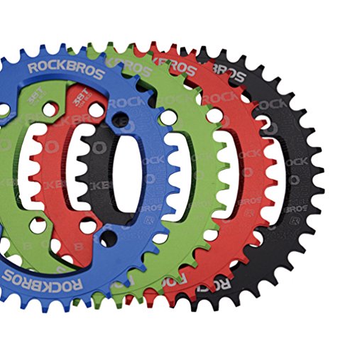Studio : RockBros Publisher : RockBros Product Description RockBros Oval Narrow Wide Chain Ring 104BCD Ultralight Product Details: Brand: RockBros Material: Aluminium alloy BCD: 104mm Shape: Oval Number of Teeth: 32T,34T,36T,38T Color: Red,Green,Blue,Black Features: Bite Firmly:Narrow wide tooth design increase the contract area with chain and grasp force.Easy to pass through bumpy road Simplify:Modifying single speed chainrings reduce the transmission system.Compact bike weight and improve your speed Durable:Made of high grade aluminium alloy,lightweight and durable,Stiff 4mm plate thickness to ensure no flexing Compaticity:Fit for various kinds of bike crank which BCD is 104mm Oval Shape:Take less effort for going up the slope with oval chainring 0
