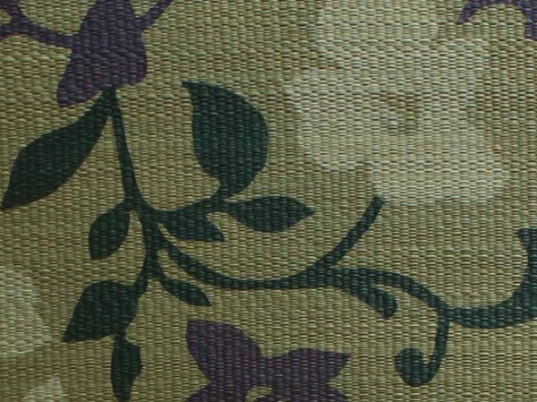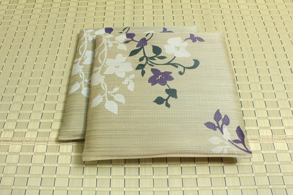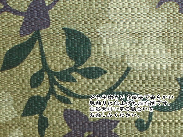 職人が1枚1枚手作業で捺染プリントを施したイ草座布団です。メセキ織という技法で柔らかい肌感触に仕上げました。またイ草の生地を縫製した後に、生地を湿らせ、裏返しにする『返し』という技法で仕上げております。イ草を通常曲げてはいけない方向に曲げますので、良い(太く強い)イ草でなければ作ることができません。返すことにより、ふっくらしたボリューム感を出しました。国産(九州産)のい草を使用しています。一本一本が太く、表皮が厚く繊維がキメ細かいので弾力性があり、耐久性に優れています。い草には空気の自然浄化作用、湿度の調節作用などがあります。また汚れにくく、使用するうちに黄金色に変化し味が出ます。い草に青森ヒバ加工を施しています(抗菌、防臭効果)。中材はウレタンをフェルトでサンドした三層構造で、適度なクッション性があります。※柄のプリントは職人が手作業で描く為、同じ色・柄であっても多少風合いが異なります。