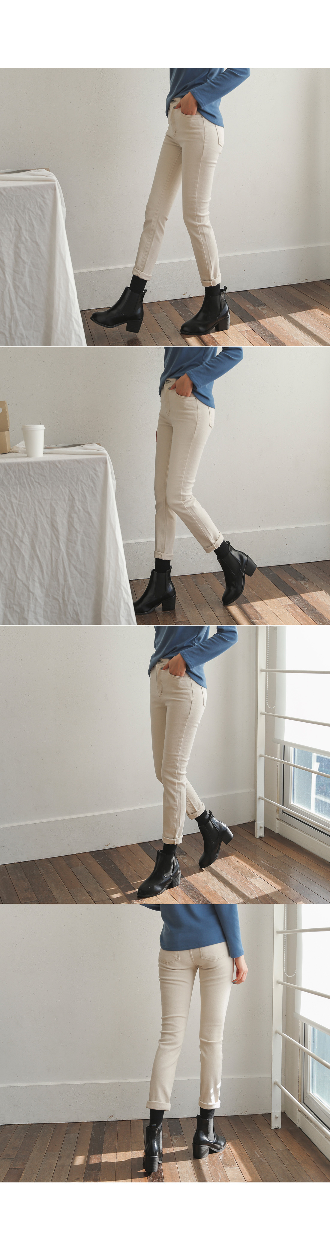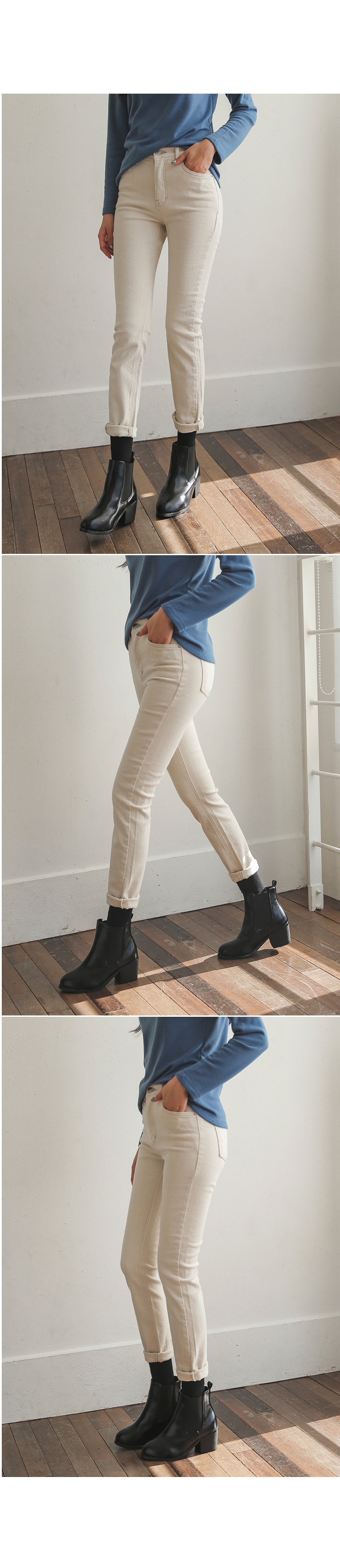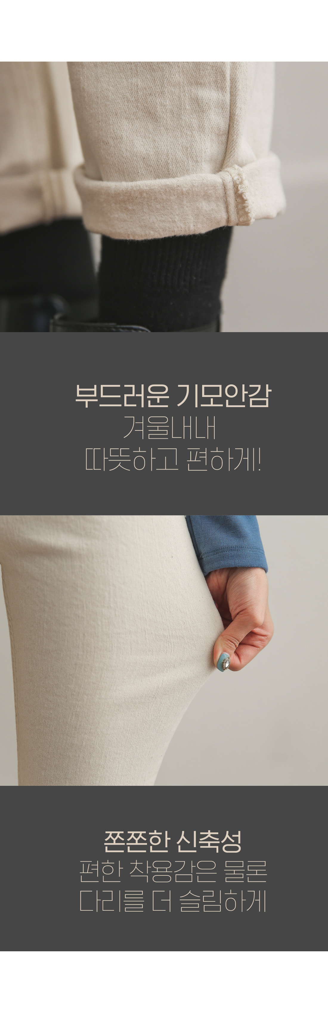 부드러운 기모안감이 있어 따뜻하고 편하게 입기 좋구요 캐주얼부터 여성스러운 스타일까지 다 잘 어울리는 팬츠에요!