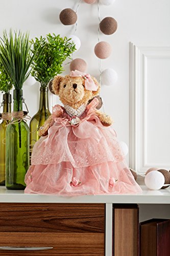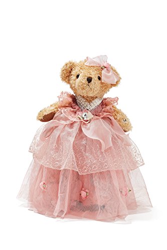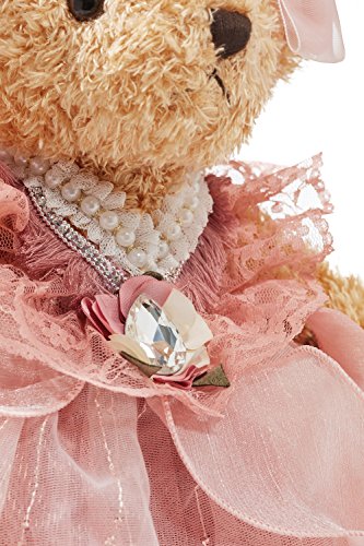 Delightful stuffed bear in a pink wedding dress decorated with crystals, faux pearls, embroidery and flowers. The toy comes with a hanging loop on the head. Great start of a teddy bear collection and marvellous addition to the existing set.