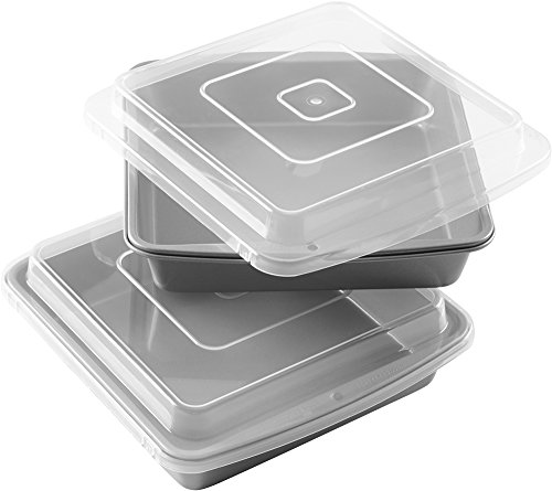 Studio : Wilton Publisher : Wilton Binding : Kitchen Product Description The perfect brownies start with quality Wilton bake ware. Recipe right is constructed of heavy-gauge steel that provides an even-heating performance, baking experts prefer for perfectly-browned baked goods. The non-stick coating makes food release and clean-up a breeze! this Multipack comes with two pans so you can bake even more cakes, brownies, cinnamon rolls and more. The convenient cover keeps your baked goods fresher longer. 0