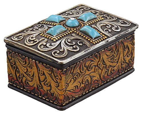 Western Scrolly Trinket Box - Tooled Leather & Turquoise Look, Rhinestone - Silver Look Top