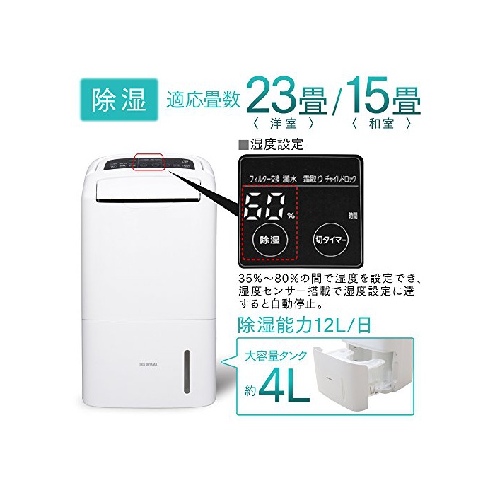 제습 가능 면적의 기준※3/목조 다다미방:15다다미(25m2)/프리패브 서양식 방:23다다미(38m2)/철근 콘크리트:30다다미(50m2)●수 탱크 용량:약4L에 자동 정지●전원 코드의 길이:약2.0m