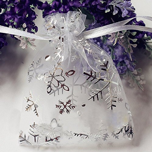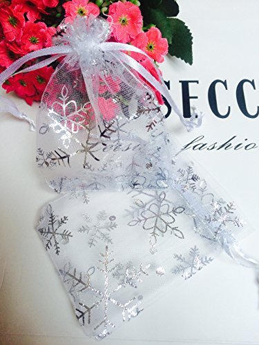 G2PLUS® 100 PCS 2.7’’ x 3.5’’ Organza Wedding Gift Bags Drawstring Jewelry Pouch Bags Silver White Snowflakes Printed Sheer Party Favor Bags