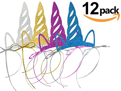 -. Feature : Unicorn Theme party hats are made of glitter colored cardboard, light and comfortable to wear. / Size:7.1"x 5.9". suit for kids and adults. / Perfect party kits for kids and adults in birthday party / Cute design : give much fun in birthday party ,wedding party, unicorn theme party. / Packing:12pcs hats and 24 ropes. ( 3pcs gold, 3pcs silver, 3pcs red, 3pcs blue)