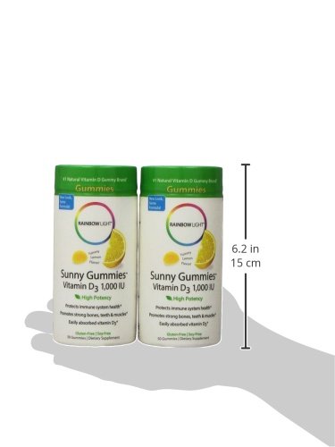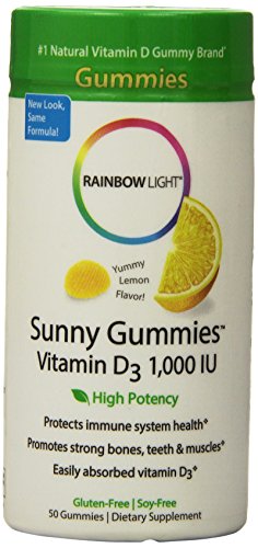 -. Binding : Health and Beauty -. Brand : Rainbow Light -. Department : Health and Beauty>Health and Wellness -. EAN : 0885367139446 -. Feature : 1,000 IU vitamin D3 in each gummy promotes bone and muscle strength, supports calcium absorption & retention in bones, strengthens nerves and muscles surrounding bones, enhances immune function, circulatory and cellular health / Current scientific research reveals significant health benefits from higher, optimal potencies of vitamin D and higher intakes are associated with long-term immune and enhanced resistance / Allergen SafeGuard - free of gluten, yeast, milk, eggs, soy, nuts, fish/shellfish / 100% natural / Sweetened with organic cane sugar -. IsAdultProduct : 0 -. Label : Rainbow Light -. LegalDisclaimer : Unless otherwise noted, this item has not been evaluated by the United States Food and Drug Administration. It is not approved to diagnose, treat, cure or prevent disease. -. Manufacturer : Rainbow Light -. Model : 12062 -. MPN : 12062 -. NumberOfItems : 3 -. PackageQuantity : 3 -. PartNumber : 12062 -. ProductGroup : Health and Beauty -. ProductTypeName : HEALTH_PERSONAL_CARE -. Publisher : Rainbow Light -. ReleaseDate : 2008-07-21 -. Size : 50 oz -. Studio : Rainbow Light -. Title : Rainbow Light Vitamin D3 (1000 IU) Sunny Gummies, Lemon Flavor, 50-Count Gummies (Pack of 3) -. UPC : 021888120628