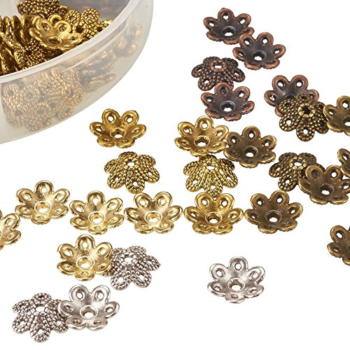 Pandahall 180pcs/box 6 Color Tibetan Style Alloy Flower Bead Caps, 6-Petal, Cadmium Free & Lead Free, Mixed Color, 9.5x10x3mm, Hole: 1.5mm