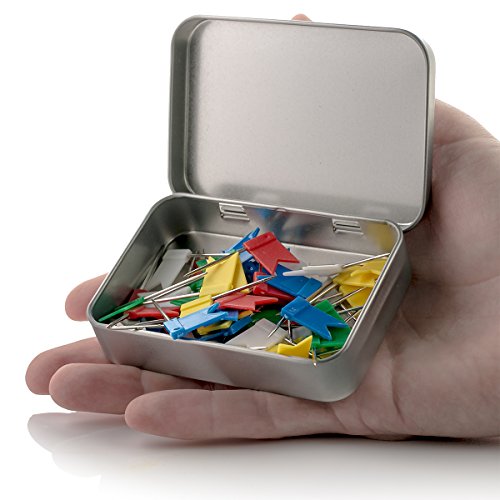RE-CLOSABLE STORAGE TIN - Includes a durable metal tin for easy access and storage. No longer have pins strewn all over desks and drawers.