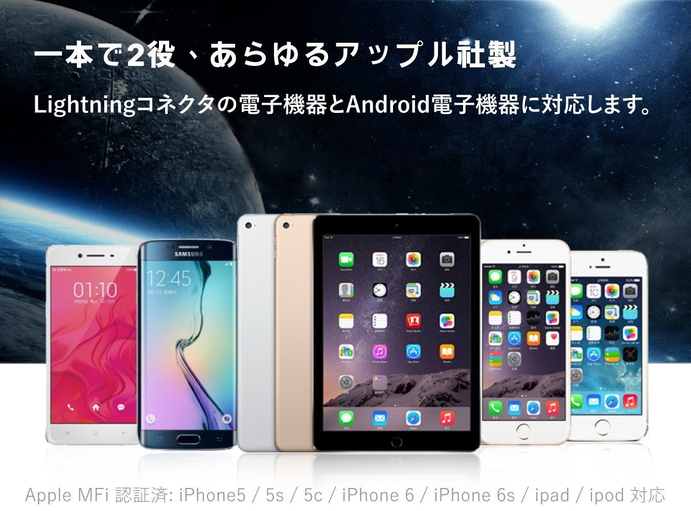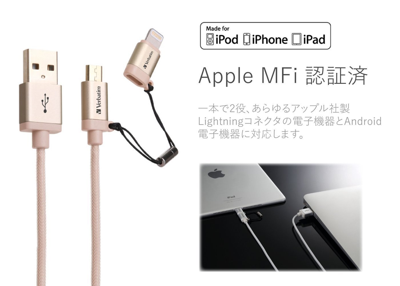 It is a charging / data transfer cable equipped with both a Lightning connector that can charge and transfer data on an iPhone or iPad and a microUSB connector that can charge and transfer data for Android smartphone.