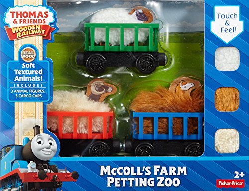 Introducing a line of Wooden Railway toys with "real feel" features, with various textures to help stimulate your child's tactile senses! McColl's Farm Petting Zoo offers several opportunities for children to touch and discover, promoting recognition of physical properties. Children will love playing out stories about the McColl's Farm petting zoo. Use the cargo cars to deliver the animals. Step right up and pet the llama, ram and sheep. Feel how soft!Feature