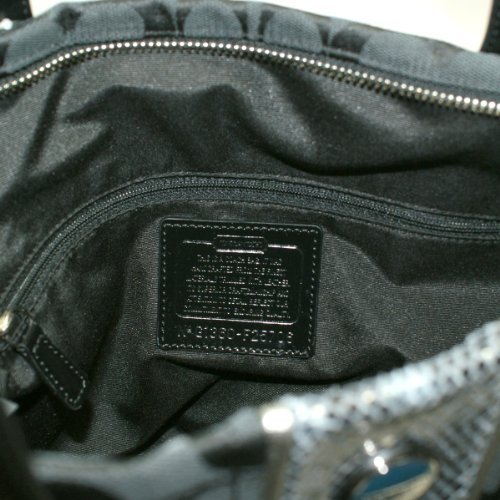 -. Feature : - Black jacquard / - Black patent leather / - Zipper closure - Black fabric on the inside / - Zipper pouch within / - (L) 13 x (H) 10 x (W) 4.5 inches