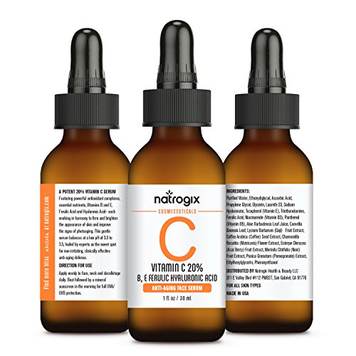 -. Feature : TOP-LEVEL VITAMIN C SERUM - Natrogix Vitamin C Serum is in concentrations of 20%, which is the most potent form of vitamin C applied to the skin. Most of Vitamin C Serum is popular for its powerful anti-aging properties, but Natrogix Vitamin C Serum is more than just anti-aging!! Natrogix Vitamin C Serum also helps shrink pores, clear up acne, prevent breakouts, and repair the appearance of acne scars - leaving skin proudly radiating a healthier appearance that glows. / SUPER POWERFUL ANTI-AGING FORMULA - Studies show topical vitamin C is 20X more effective than taking it orally to replenish your skin's vitamin C levels that naturally decline over time. Natrogix Research Team added Hyaluronic Acid, Ferulic Acid and, vitamins B and E together combined a "super powerful anti-aging formula", which help promote new collagen growth, visibly reduce the signs of age in the skin, and protects the skin from environmental damage and premature aging. / HIGH QUALITY INGREDIENTS - Natrogoix Vitamin C serum delivers all anti-aging benefits with highest quality natural plant-based ingredients. Natrogix adds no parabens, no alcohol, and no any other chemicals that irritate the skin. This concentrated vitamin c serum has not only been proven to be effective, but it's surP.R.Isingly gentle too, and the perfect solution for even the most sensitive skin types. / HOW TO USE? Get few drops vitamin C Serum from dropper bottle, apply them to the face and neck that have been cleansed and toned. And make sure that the vitamin C serum has been absorbed completely before moving onto other steps in your skincare routine or your makeup application. You can apply a vitamin C serum once or twice a day depending on your personal preference and how your skin responds. / LIFETIME 100% MONEY-BACK GUARANTEED FROM NATROGIX - RISK-FREE & MADE IN THE USA - Use with P.R.Ide and confidence 100% Money Back GUARANTEED - Full Money Back even with an empty bottle. We're committed to ensuring that every product meets stringent quality control procedures for purity, potency, and safety.