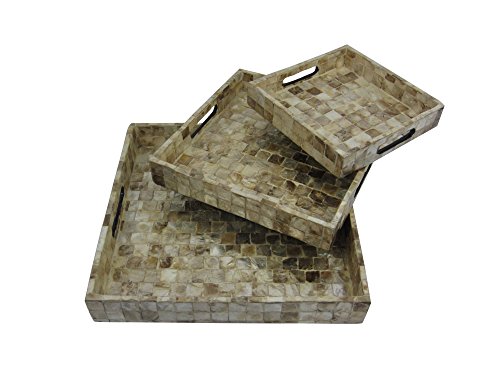 Firefly Home Collection 3 Piece Cream Mother Of Pearl MDF Trays Set, 16" x 16" x 2.5"/13" x 13" x 2"/10" x 10" x 1.7"