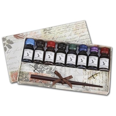 -. Feature : A great set for novices and experts alike! Each Set includes: / Nostalgic Wood Dipping Pen with two additional nibs / 8 pc. Assortment of Water-based Quality Writing Inks in screw-top Apothecary Jars (1 oz of ink . per bottle). / Ink Colors are Dark Blue, Light Blue, Black, Green, Red, Violet, Burgundy and Sepia. / Beautifully gift-boxed in hardcover printed gift-box