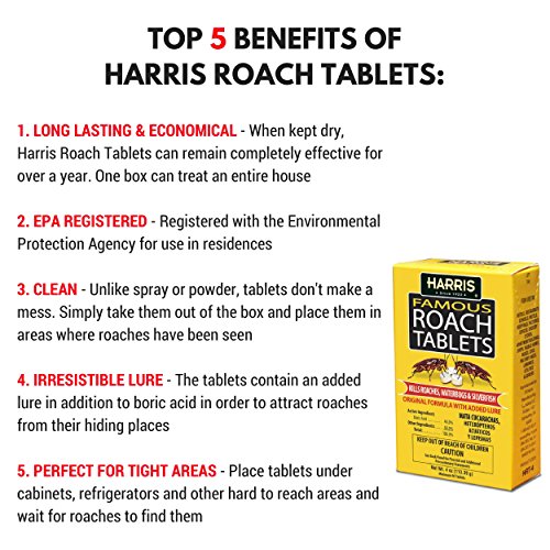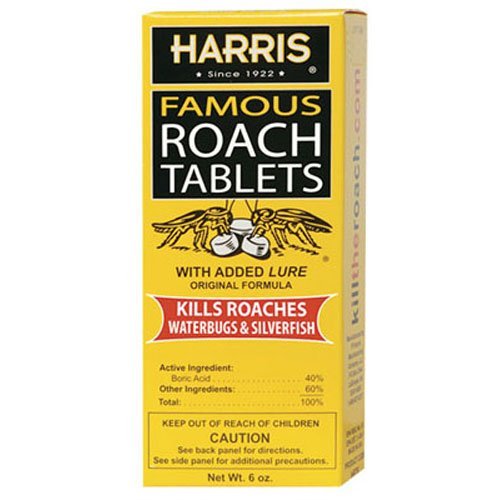 Boric Acid formula with added lure, kills Roaches, Waterbugs & Silverfish. Just place tablets in out-of-the-way areas where roaches travel and roaches will find them. One box can treat an entire house, making it one of the most efficient and cost-effective ways to kill a roach. Place no more than twelve tablets per room in sites, such as under and behind refrigerator, stove, sinks, tubs, dishwasher, washing machine, dryer, into openings around drains, water pipes and electrical conduits, and in cracks and crevices along baseboards and corners of cabinets, cupboards and closets. Remove all lower drawers in kitchen and bathroom cabinets, bedroom dressers and chests of drawers. Then place tablets in drawer wells. Any tablet visible after application must be pressed into cracks and crevices or removed. Reapply as necessary. This item is registered with the EPA (No. 3-1).Feature