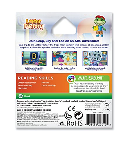 Join Leap, Lily, and Tad on an ABC adventure with the LeapFrog Explorer Game: Letter Factory! On a trip to the Letter Factory, the frogs meet Burfder, who dreams of becoming a letter. Help Burfder achieve his alphabet ambition while learning letter names, sounds, practicing writing, collecting letters, and more. LeapFrog Letter Factory Explorer Learning Game works with all LeapPad learning tablets, LeapsterGS & Leapster Explorer (sold separately). Internet connection may be required for cartridge.