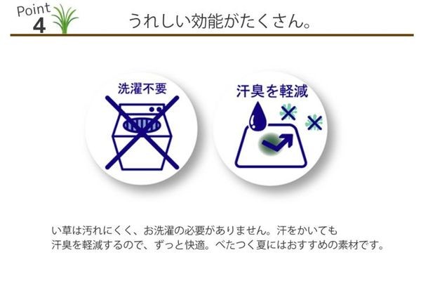 寝っころがってテレビを見たり、折りたたんで腰かけたり、リビングでのお昼寝用に、などいろいろな使い方ができるフリーマットです。お仕事のちょっとした休憩時間の仮眠にも最適です。い草には1.綿の約3倍の吸湿性があり汗のじめじめを軽減します。2.湿度の調整作用があり、蒸れにくく快適な就寝を促します。3.汗のにおいの元となる化学物質を90%以上抑え、においを軽減します。などの効果があります。中材には固わた40mmを使用していますのでフローリングでも快適にご使用頂けます。い草に青森ヒバ加工を施しています。(抗菌・防臭効果)青森県のヒバの木から抽出した「ヒバ油」を現地に送り、メーカー独自の技術で材料や商品に加工しました。「ヒバ油」には、ヒノキチオールという天然物質としては極めて抗菌性の高い成分が含まれ、医療や食品など多分野で利用研究が進められています。※自然素材であること、また職人が一つ一つ手作業にて加工を行うため、形状のバラつきや表示サイズと多少異なることがあります。ご了承下さい。