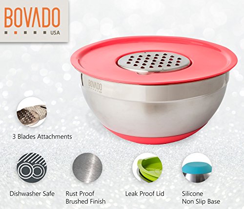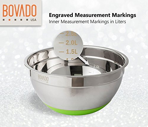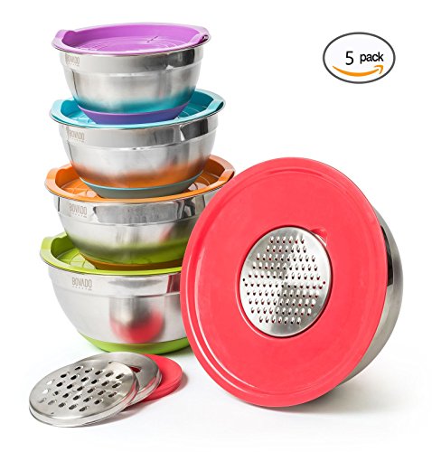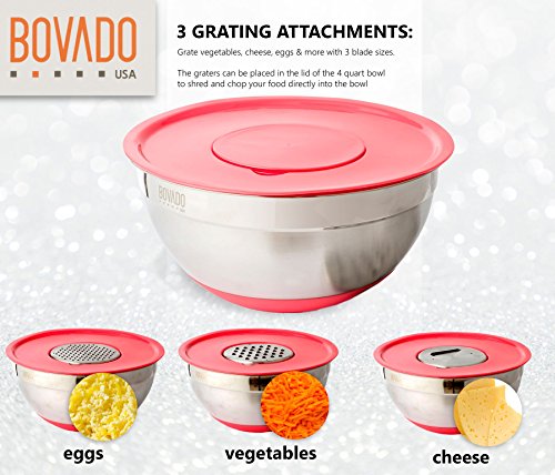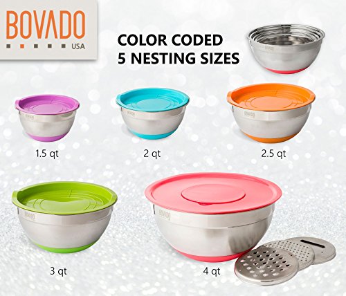Stainless Steel Mixing Bowl Set- 5 Bowls with Plastic Lids and 3 Graters - Stackable and Nesting with Non Slip Base - Set includes 1.5, 2. 2.5, 3 and 4 Quart Bowls - by Bovado USA