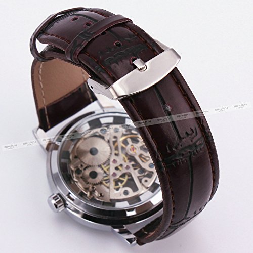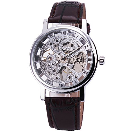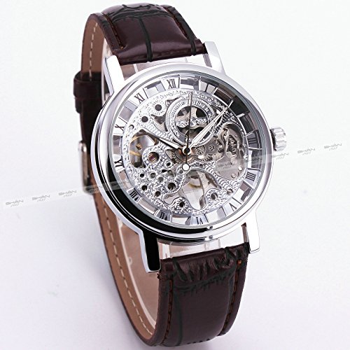 -. Title : WINNER Skeleton Roman Retro Hand-wind Men's Mechanical Wrist Watch Black Leather Strap Silver Case