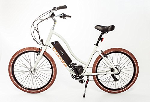 Studio : Biktrix Publisher : Biktrix Product Description The Biktrix Stunner Step Thru Electric Cruiser is now upgraded! This 500 watts Mid Mounted Gear Motor Electric Bicycle has a clean design and truly deserves its name. Its world class performance with 900W peak power and 32 miles/charge from its Samsung 36V10.4Ah battery will keep you going and allow you to climb steep hills with ease. Suspension seat post for added comfort. Also only 2 hours to full charge. Total weight of 50 lbs is much lower than the typical electric beach cruiser bike. No license, registration, or insurance is needed to begin using these bicycles which meet the federal regulations regarding speed and power output SPECIFICATIONS:Motor: Mid Mounted Geared Motor Bafang 8 Fun 500w, 900w peak power Drive Mode: Cadence sensing pedal assist and trigger throttleBattery: Samsung Lithium Ion 13S4P Configuration 36V/10.4Ah Charge time: 5 hours Display type: Bafang, fixed backlit monochrome LCD Readouts: battery level (4 bars), speedometer, Assist level (0-5) trip distance, odometer, average speed, max speed Frame: 19.5in Chromoly Steel Gears: Shimano 3 speed internal hub SIS Thumb Shifter Pedals: Wellgo Aluminum Alloy Platform Headset: Neco Stem: Neco adjustible angle Handlebar: Aluminum alloy, cruiser style Brakes: Front disc Rear high performance drum with Integrated Motor inhibitor levers Grips: Ergonomic rubber Saddle: Velo Oversized Plush Cruiser styleSeat Post: Aluminum Alloy Rims: Double Walled Aluminum, CNC Sidewall 13 gauge black spokesTires:Kenda K-Shield Puncture Resistant 26x2.6 Chain: KMC Rust-proof Frame Fork Rigid FREE FENDERS and FREE SOLAR CHARGER FOR CELL PHONES 16000mAh lithium polymer battery Super waterproof and dustproof. Strong shockproof and drop resistance. Dual USB and micro USB ports. Emergency LED torch works perfectly in darkness, Environmentally friendly silica gel and ABS PC materials, and rubber paint surface process Compact, portable stylish design. 0