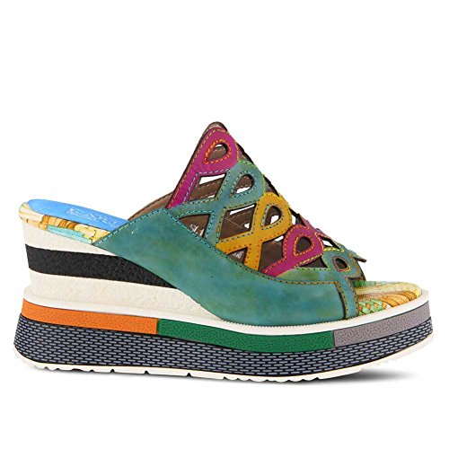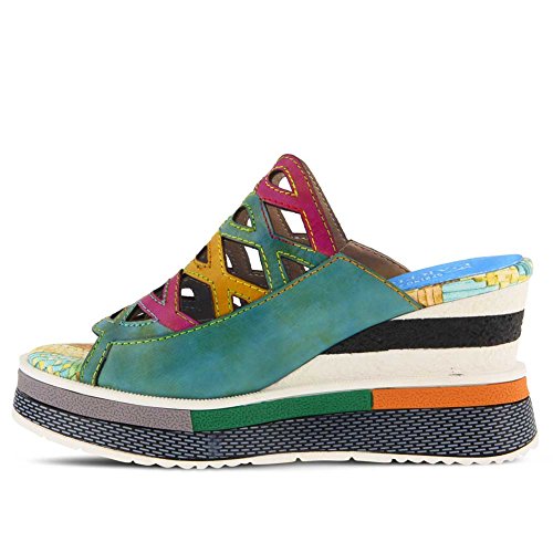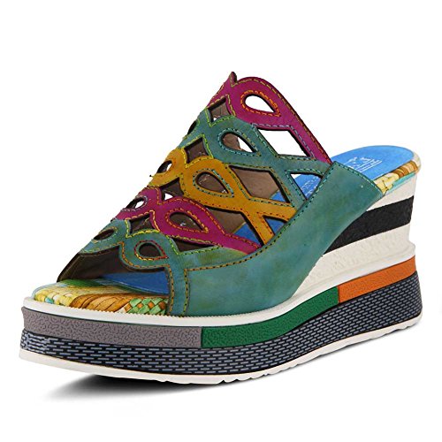 Product DescriptionFrench inspired, multi-color hand-painted leather slide sandal featuring laser cutouts on a printed and painted platform wedge.0