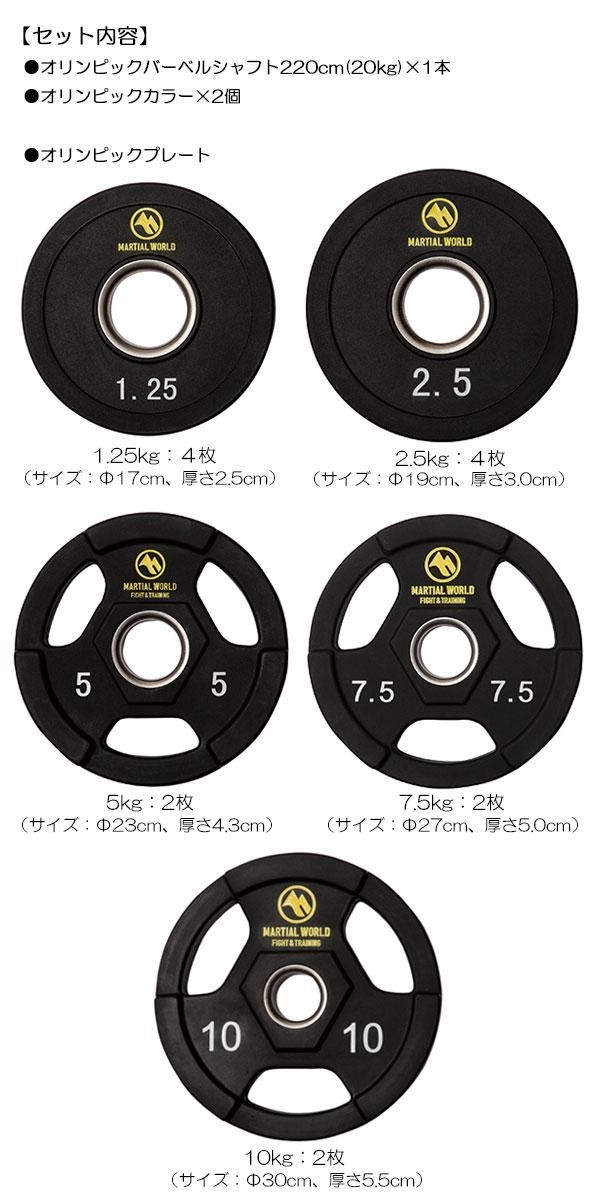 | セット内容 | オリンピックバーベルシャフト220cm(20kg)×1本、オリンピックプレート(1.25kg:4枚、2.5kg:4枚、5kg:2枚、7.5kg:2枚、10kg:2枚)、オリンピックカラー×2個 |
