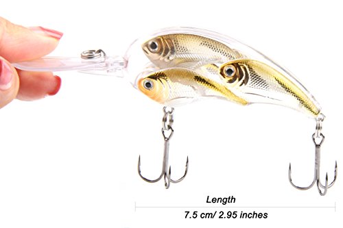 -. Feature : Perfect size: 7.5cm length, 23g weight, up to 4m diving depth, can achieve a longer distance casting and trolling / 3D stereo eyes, full bionic fish scales, excellent streamline shape, make bait more lively in the saltwater and freshwater / Unique school of design: built in three artificial baits, imitate realistic panic fled action of a group of fish, an irresistible temptation and attack desire for big fish / Two VMC nickel black hooks and stainless steel wire meson ring, make the bait more sharp and solid, not easy to be distorted, ideals for largemouth bass, carp, trout and other predatory fish / Bright color, vivid coating, internal four steel balls, make loud noise, easier to catch the fish attention