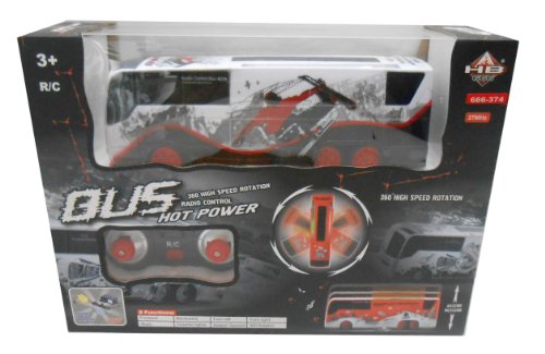 This High Powered Radio Control Party Bus is not your typical Remote Control Vehicle. With a total of 8 Functions, there are so many ways to play with this R/C Bus! Features a full function (forward, backward, turn left, turn right) remote with colorful lights and music. Bus can move at high speeds and can even "Ascend" and "Descend" with the push of a button. But the best part is this stunt vehicle can do 360 degree high speed spinning rotations! Get yours today!Feature