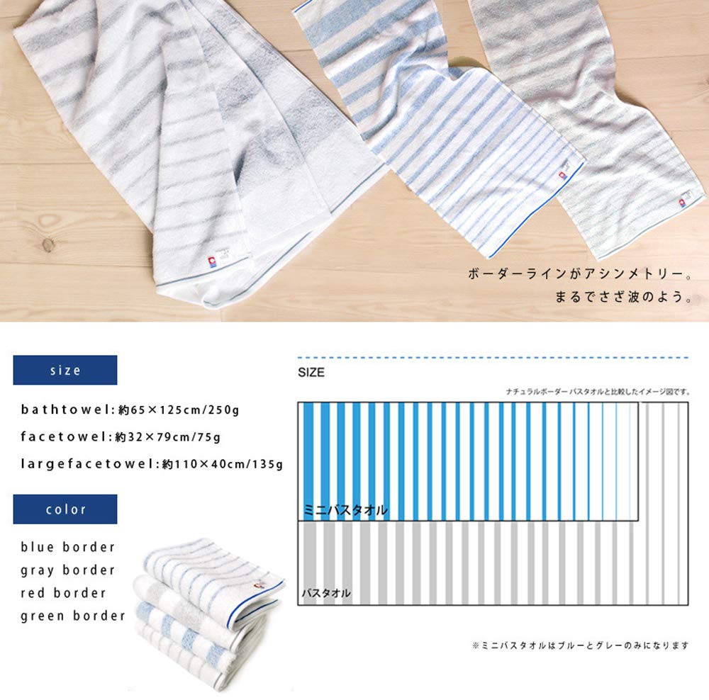 【今治タオルをデイリーに】使い勝手の良いボーダー柄と程よい厚みで、デイリーに使いやすい今治タオルです。バスタオル・フェイスタオル・ミニバスタオルのサイズをご用意しております。箱入りのタオルギフトも販売しております。