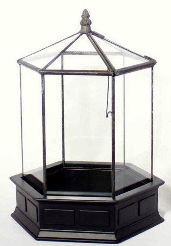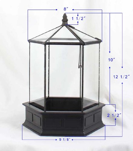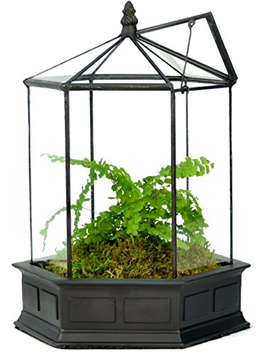 This terrarium design is based on classic English conservatory styling. Cast resin base with geometric detailing will not rust. Glass wardian case constructed like a stained glass lamp with lead-free solder to protect you and the environment. Stately finial tops the unit. A great gift for special someone or even add it to your own wish list today! Planting your terrarium: Start with a layer of pebbles and mix in a handful of charcoal chips, spread this mixture evenly on the bottom of your tray. Next add a layer sphagnum moss followed by a layer of soil to nearly fill your tray. Make small holes where you wish to insert your plants. If your plant has a root ball larger than the depth of your tray gently tease out the roots horizontally. Once you insert your plants into the little holes, bury the roots and tamp the soil to help remove air pockets. Water very lightly as your terrarium will be recycling its own water and you don't want waterlogged soil. If you are using moss: Moss Transplanting Techniques #1 To bring your moss back to life, soak each section of moss by hand in a bowl or even on a place on a rimmed cookie sheet and cover with water until saturated. #2 After about a minute the moss will become more pliable and easy to work with, (leaving it to absorb more water for a longer time period is fine). #3 Arrange you plants in the soil as desired #4 Place each moss section on the terrarium soil around your plants and firmly press or tamp the moss into the soil with your hand to ensure there are no air pockets underneath. Place the glass top on your terrarium, sit back and relax. What you place inside your terrarium is entirely a matter of personal taste. Do you prefer a green oasis? Do you enjoy the mystic of a fairy garden? Or perhaps exotic orchids are your fancy? The choices are endless. Your imagination is the only limit.Feature