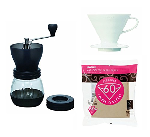 -. Brand : Hario -. Color : White -. EAN : 0705332275644 -. Feature : Porcelain Dripper is designed with raised, spiraled ribs so water will flow both through the sides as well as the bottom of the filter for a more balanced, delicious brew. / 100 paper filters designed for the V60 serious / Skerton ceramic coffee mill - Easy to use, portable, hand grinder - Ceramic and stainless steel construction makes grinder fully washable / Designed to crush the beans to release more flavor - Adjusting knob allows you to set the coarseness of the grind. / Resistant to picking up odors and stains so it will always make delicious coffee -. Label : hario -. Manufacturer : hario -. PackageQuantity : 1 -. ProductGroup : Kitchen -. ProductTypeName : KITCHEN -. Publisher : hario -. Studio : hario -. Title : Three Hario Products Sold Together - Hario Mill, V60 Porcelain Dripper With Spoon and 100 Paper Filters -. UPC : 705332275644