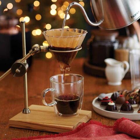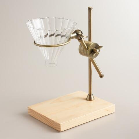 -. Brand : World Market -. Color : Brass Gold -. EAN : 0725264248462 -. Feature : Crafted with an adjustable, industrial-style brass arm, a rustic wood base and a clear glass cone dripper, pour-over coffee stand is a stunning, affordable gift for slow-brew coffee aficionados. / Crafted of wood and metal with brass finish Includes glass cone coffee dripper. / For use with #4 coffee filters, not included / This drip coffee maker is gorgeous to look at, functional, makes great tasting coffee and is a conversation piece to boot. -. Label : World Market -. Manufacturer : World Market -. PackageQuantity : 1 -. ProductGroup : Kitchen -. ProductTypeName : KITCHEN -. Publisher : World Market -. Studio : World Market -. Title : Brass Pour Over Drip Coffee Maker Dripper Stand with Wood Base -. UPC : 725264248462